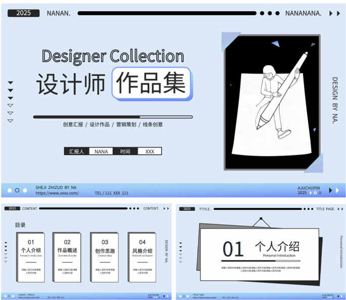 插画设计师个人作品集展示简介求职面试排版PPT模板设计素材