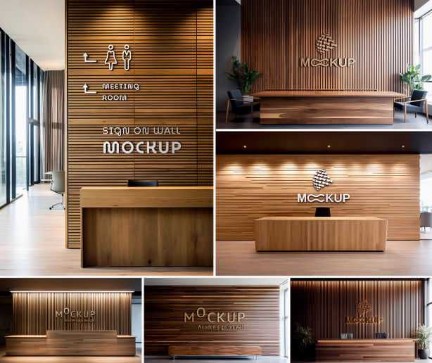 标志Logo木头质背景墙文字指示室内导引PS样机贴图设计模板素材12款
