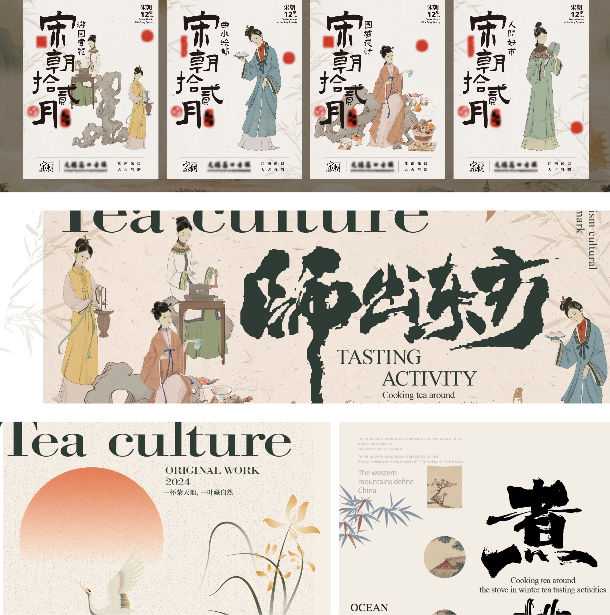 这是一套专为古风宋朝国潮仕女图煮茶主题设计的海报展板和活动物料AI矢量设计模板素材,采用新中式中国风设计风格,适用于各种市集活动和宣传物料制作。该素材提供完整的矢量设计文件,确保在各种应用场景中保持清晰和专业。