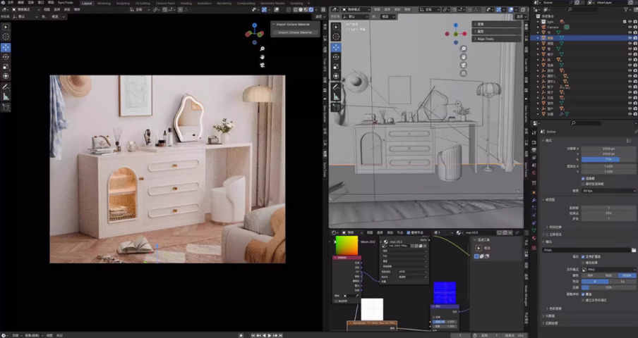1.21GB完整Blender 4.0工程,现代轻奢梳妆化妆台卧室场景,自带PBR材质与灯光预设,一键渲染即得4K高质量静帧/动画。含梳妆台、镜面、化妆品、衣柜、软包床、射灯、窗帘等室内元素,Cycles/Eevee双渲染器通用,电商主图、室内设计、动画番剧、虚拟直播、作品集直接出片,零建模零布光即可上架。