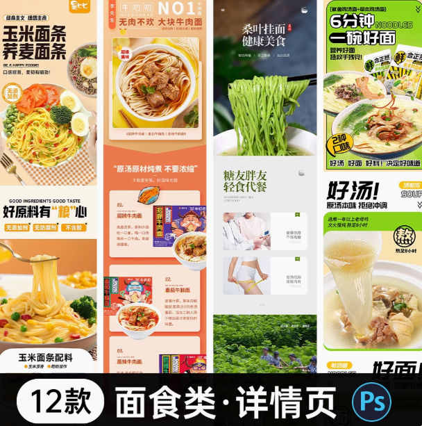 这是一套专为餐饮美食行业设计的电商详情页模板,包含12款不同风格的PSD格式模板,适用于米线、面条、螺蛳粉等小吃食品的电商店铺页面设计。该模板采用高质量的视觉设计,能够有效提升产品的吸引力和店铺的专业形象,帮助商家快速搭建吸引人的商品详情页。