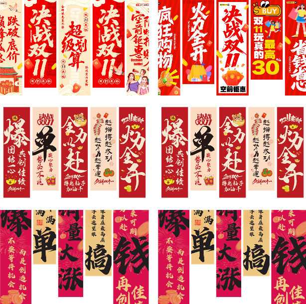 5套高分辨率双十一主题长吊幔背景布源文件,PSD+AI双格式,542MB高码流,专为电商线下美陈、商场中庭、品牌快闪、直播间布景设计。含热销爆单、限时直降、跨店满减等主题元素,中国红+鎏金渐变配色,3分钟替换Logo与活动时间即可输出写真、喷绘、UV,即挂即售。
