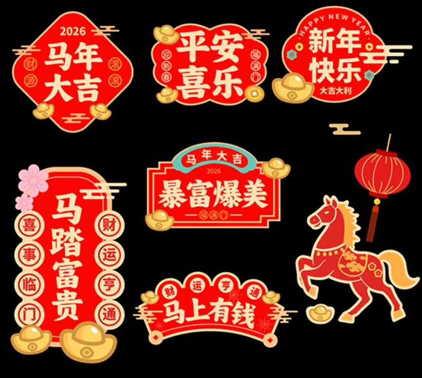 • 祝福语分层:新年快乐、马到功成、恭喜发财可改字换色,适配品牌口号