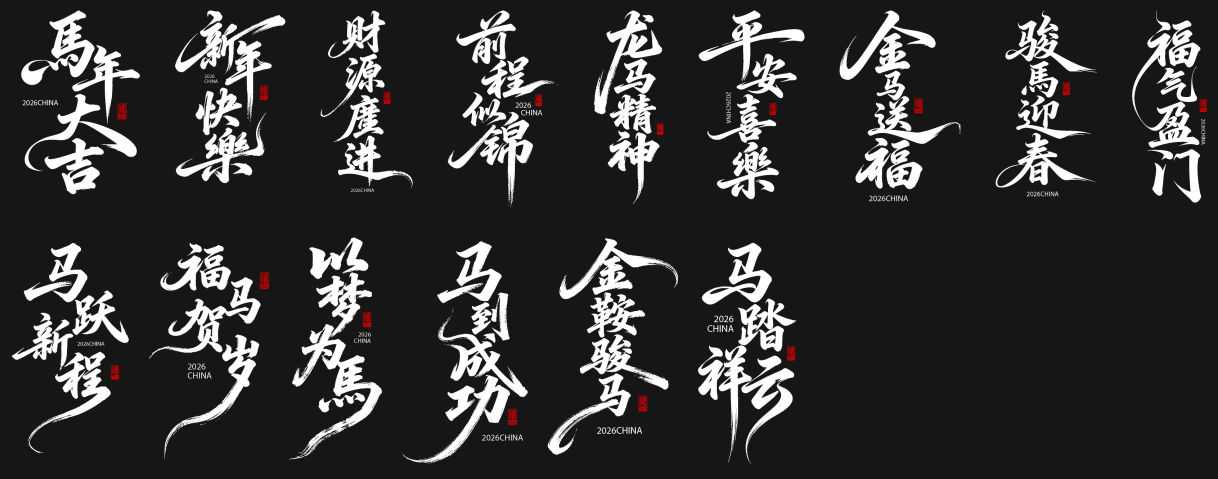 2026农历马年限定创意书法字体,单款AI矢量源文件,专为新年品牌视觉、活动主KV、商品包装量身定制。字体融合“马跃新程”吉祥寓意与传统毛笔韵律,线条流畅、张力十足,可在Illustrator内无限放大、改色、增删笔画,3分钟输出高质春节视觉。