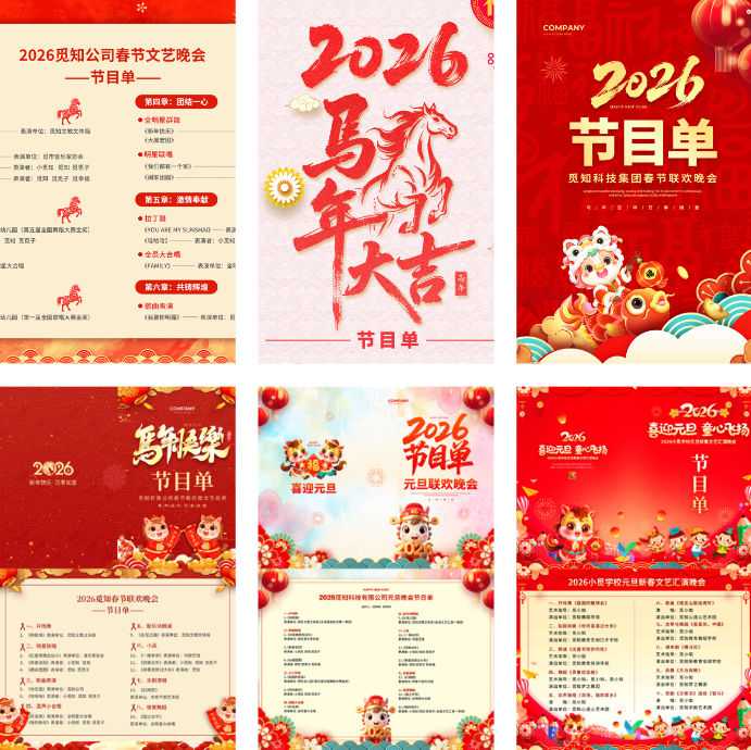 素材介绍:本作品内容为2026马年元旦晚会节目单PS海报模板国潮新年春晚节目排版设计素材10套, , 大小2.78 GB; 欢迎使用。